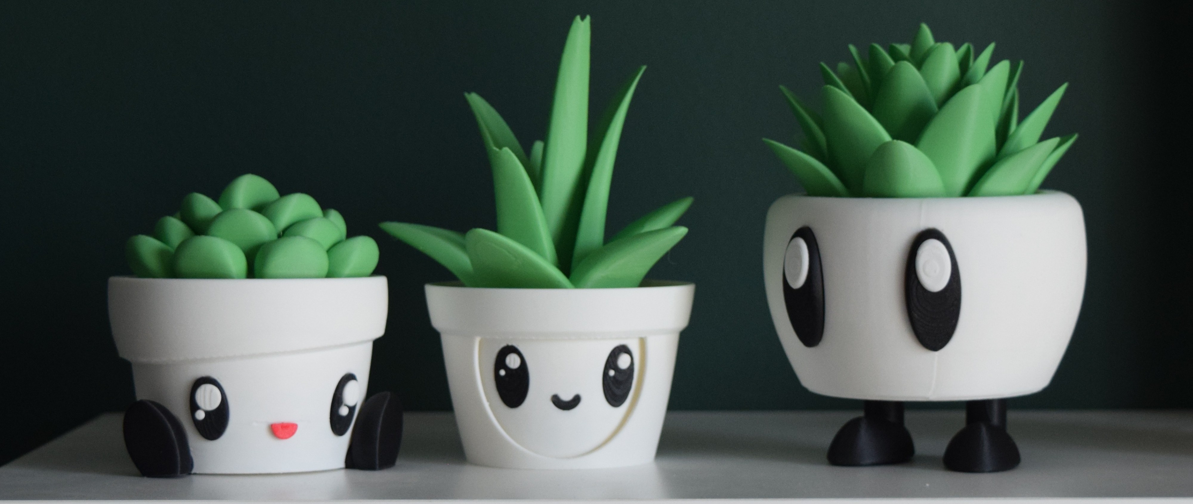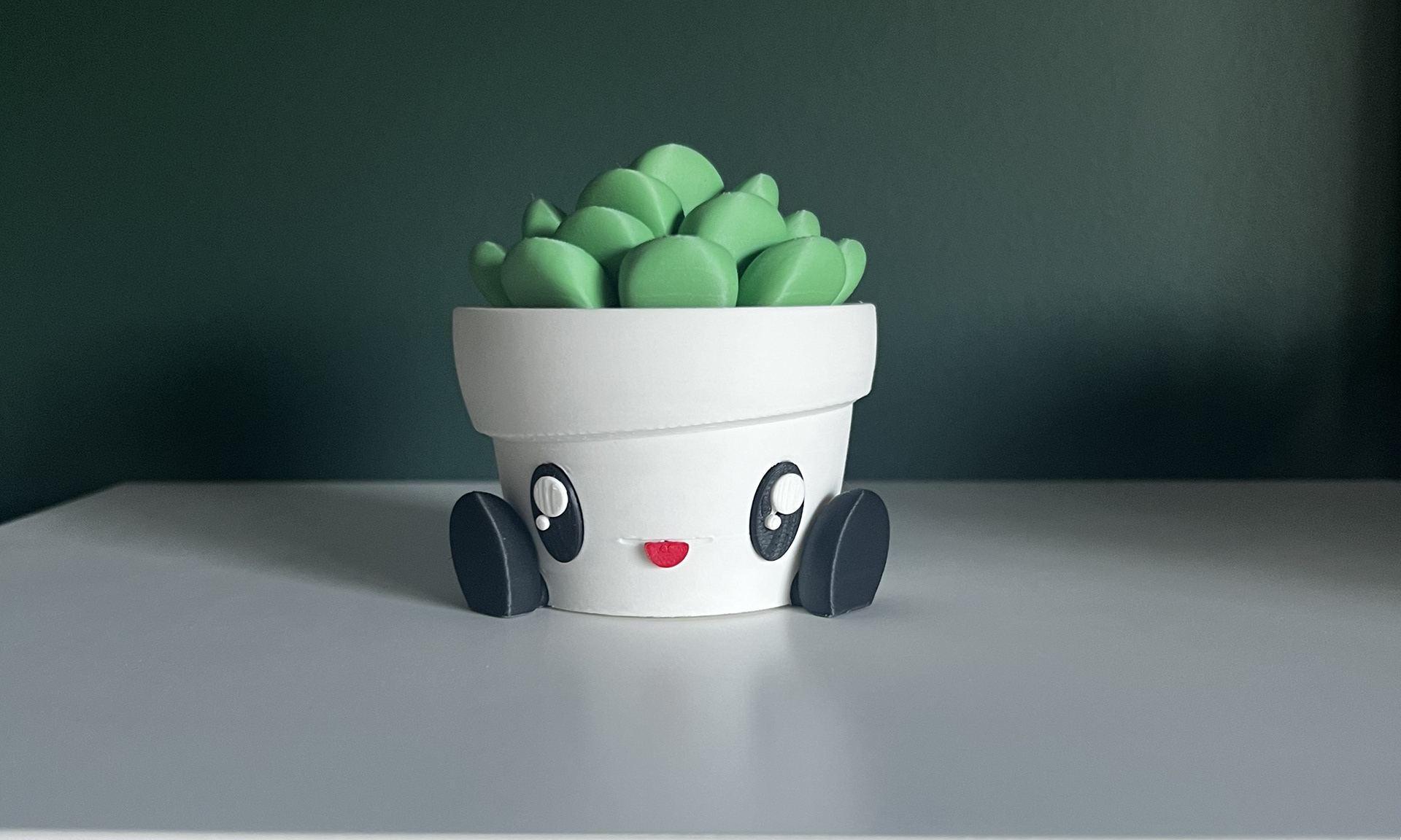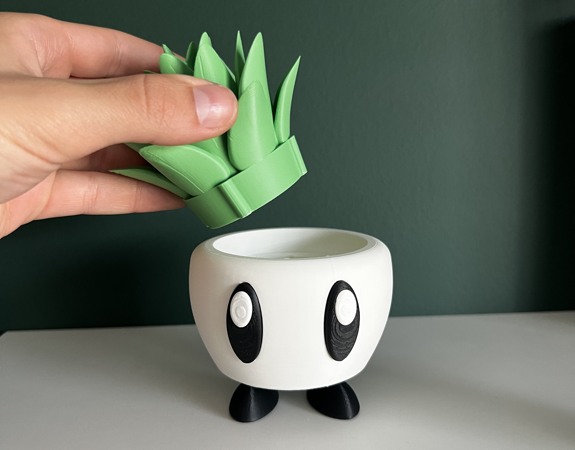 Moody adds interactivity to the mix. With a rotatable pot that reveals either a happy or angry face through a cut-out window, Moody is your desk’s built-in mood indicator. Spin it around to show how you're feeling—whether you're ready to chat or want to be left alone. The spinning pot prints in place (no assembly required for rotation), while the plant top and eyes are printed separately. Modular compatibility with the rest of the Plant Pals lets you swap out tops as you like.
